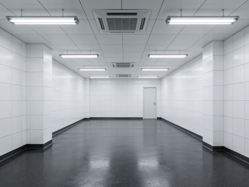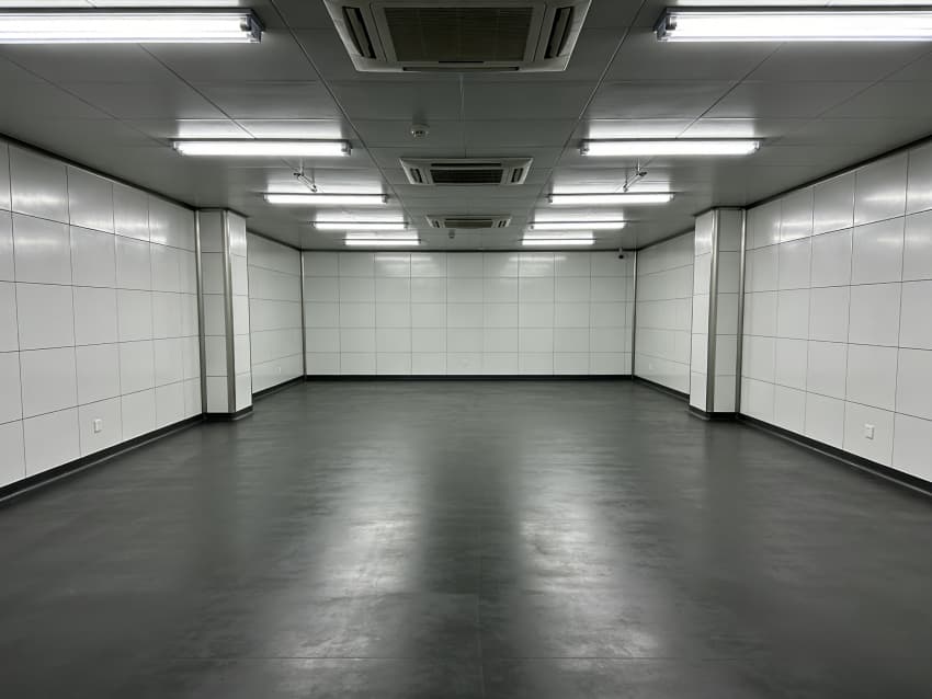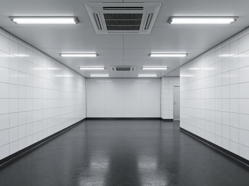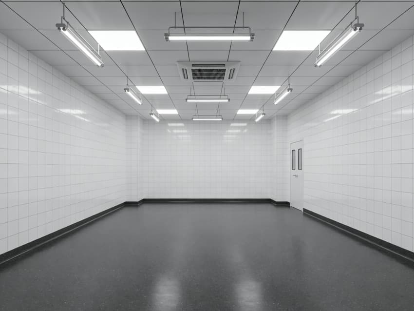 車間內(nèi)部施工工藝凸顯耐腐潔凈特性:地面采用深灰色重防腐環(huán)氧自流平工藝,經(jīng)基層噴砂處理、防腐底漆涂刷、環(huán)氧砂漿找平、自流平罩面四道關(guān)鍵工序,表面平整度誤差≤1mm/m,耐酸堿、耐有機(jī)溶劑腐蝕,附著力達(dá)2.0MPa以上;墻面采用白色食品級潔凈抗菌涂層施工,推行無縫拼接技術(shù),陰陽角采用R50圓弧倒角工藝,杜絕積塵死角,涂層硬度達(dá)2H,可耐受高頻次消殺。