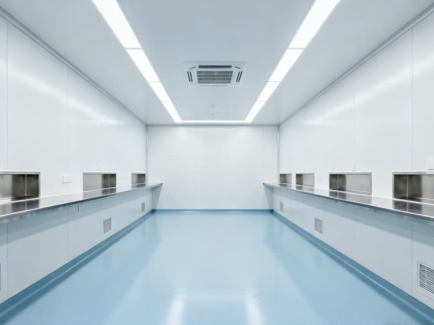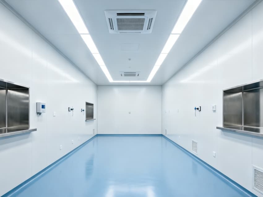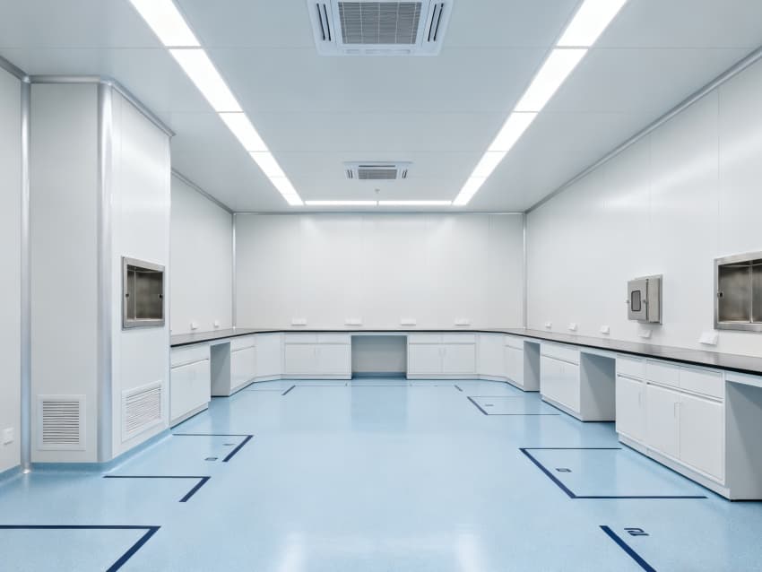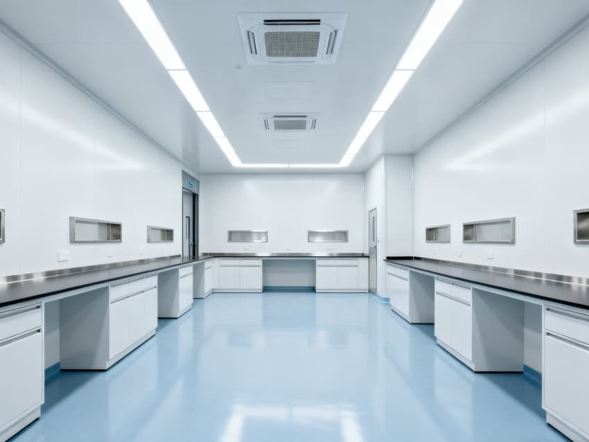 內部6個實驗室均為無設備空曠布局,按萬級潔凈標準建設:地面鋪設無縫抗菌環氧自流平,墻面采用食品級不銹鋼潔凈墻板,陰陽角做R40圓弧處理杜絕積塵死角;柱網間距設為7.5米,預留實驗臺、精密檢測設備安裝點位及運維通道;頂部整合高效新風過濾系統、恒溫恒濕裝置與防眩光LED照明,所有管線暗藏于吊頂內,最大化釋放空間高度與視野;實驗室間通過通透玻璃隔斷銜接,進一步強化整體空曠感,為藥物合成、質量檢測等核心研發環節提供安全、潔凈的專屬環境。