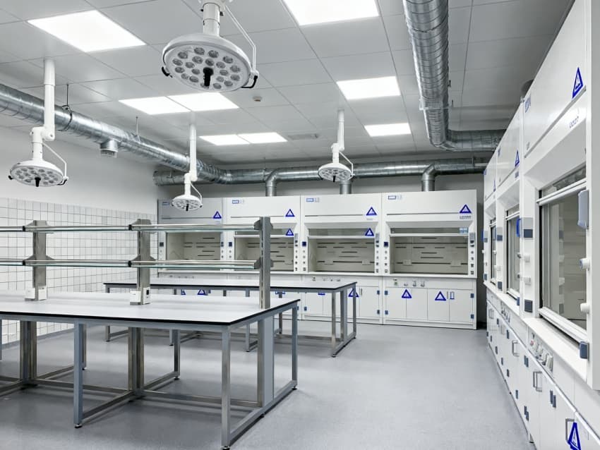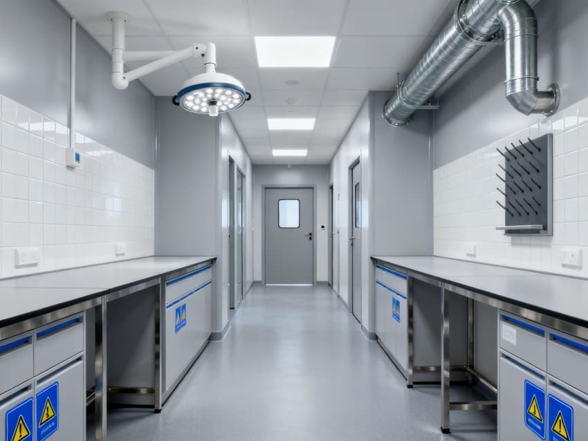 本生化研究實驗室凈化工程嚴(yán)格遵循ISO7級潔凈標(biāo)準(zhǔn),將實驗空間科學(xué)劃分為四大核心功能區(qū)域:樣品前處理區(qū)配備通風(fēng)櫥、震蕩儀等預(yù)處理設(shè)備,采用負(fù)壓設(shè)計防止交叉污染;試劑配制區(qū)設(shè)有獨立的天平室與超純水系統(tǒng),通過溫濕度智能調(diào)控系統(tǒng)將環(huán)境參數(shù)穩(wěn)定控制在±1℃與45%-60%RH;精密檢測區(qū)配置防震臺與電磁屏蔽裝置,可滿足高效液相色譜、質(zhì)譜儀等精密儀器的運行需求;無菌操作區(qū)配備層流凈化工作臺與生物安全柜,配合動態(tài)浮游菌監(jiān)測系統(tǒng),確保實驗環(huán)境達到百級潔凈度標(biāo)準(zhǔn)。各功能區(qū)通過氣密式緩沖間與機械互鎖傳遞窗形成物理隔離,構(gòu)建起三級防護屏障。在保障蛋白質(zhì)分離純化、核酸提取擴增等常規(guī)實驗高效開展的同時,還專門設(shè)計了酶活性檢測專用恒溫恒濕實驗室,采用獨立的凈化空調(diào)系統(tǒng)與UPS不間斷電源,可支持對環(huán)境參數(shù)高度敏感的高精度研究項目。此外,工程特別設(shè)置雙通道應(yīng)急處理系統(tǒng),包含緊急洗眼裝置、消防噴淋系統(tǒng)與防化物資儲備間,配合逃生路線熒光標(biāo)識與應(yīng)急照明系統(tǒng),全方位保障實驗人員安全與科研數(shù)據(jù)完整。?