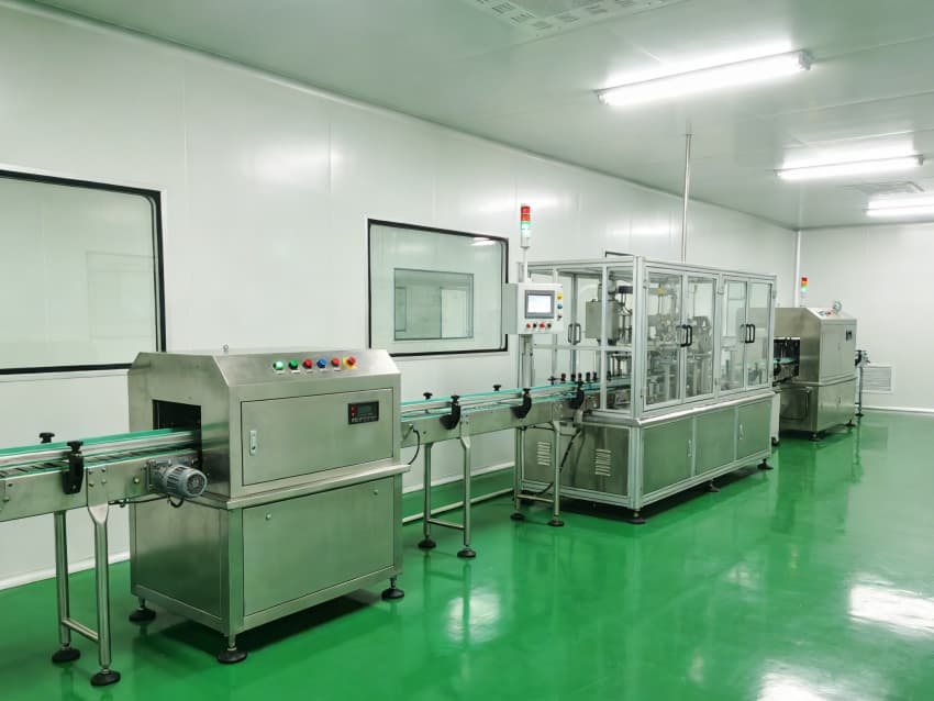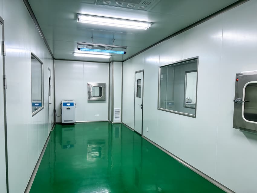 整體空間采用醫(yī)藥級(jí)潔凈圍護(hù)體系:墻面與頂板選用抗菌型潔凈彩鋼板,搭配圓弧角收邊與密封膠條,徹底消除積塵死角;地面為綠色防靜電環(huán)氧自流平材質(zhì),表面光滑耐磨、易清潔消毒,同時(shí)具備靜電消散功能,避免靜電對(duì)藥品的潛在影響。吊頂集成 FFU 風(fēng)機(jī)過濾單元與恒溫恒濕控制系統(tǒng),可穩(wěn)定維持十萬級(jí)潔凈度與 18-26℃的工藝環(huán)境,通過壓差管控保障各區(qū)域空氣單向流動(dòng),有效防止交叉污染。