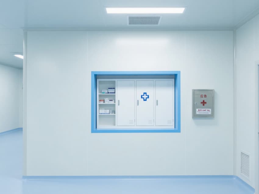 走廊與操作區(qū)通過(guò)玻璃隔斷分隔,門(mén)框與墻角均做圓角處理,配備嵌入式不銹鋼傳遞窗。地面標(biāo)識(shí)線(xiàn)采用醫(yī)用藍(lán)啞光材質(zhì),指引動(dòng)線(xiàn)的同時(shí)避免反光干擾,整體空間雖無(wú)設(shè)備,卻通過(guò)細(xì)節(jié)設(shè)計(jì)全方位展現(xiàn)醫(yī)藥生產(chǎn)的嚴(yán)苛潔凈要求。