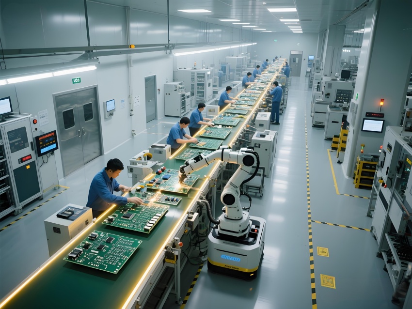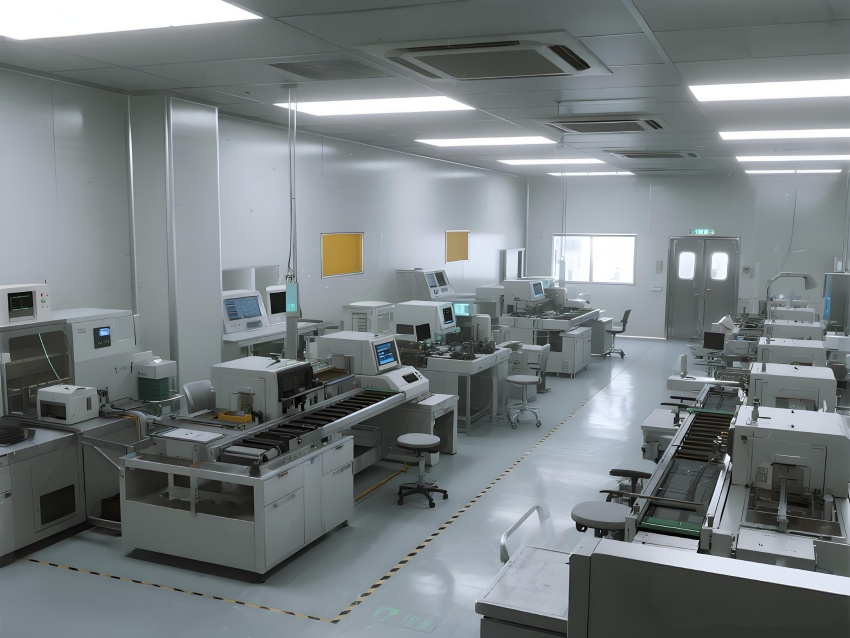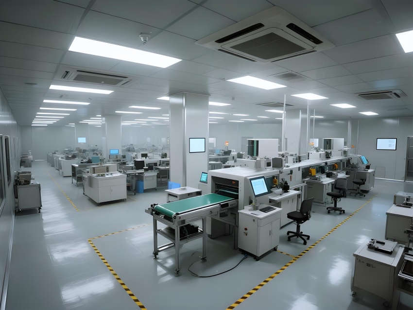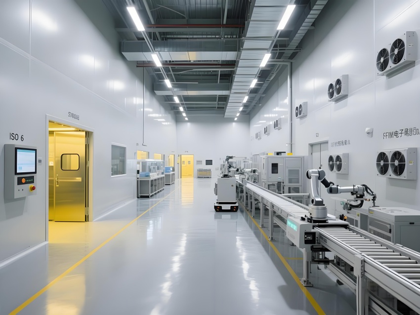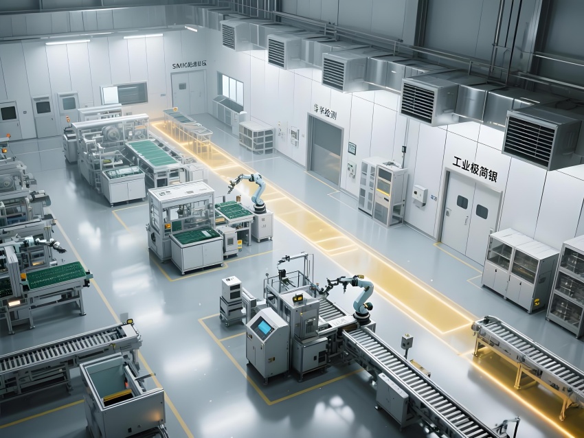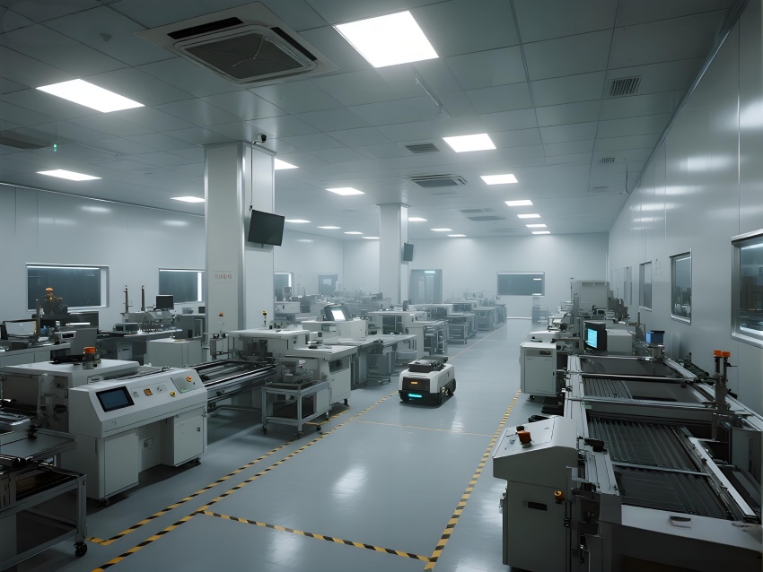 本車間以"精密工業(yè)美學(xué)"為設(shè)計(jì)主題,構(gòu)建銀灰色主調(diào)的科技制造空間。頂棚矩陣排列的FFU單元形成蜂巢狀光影,與地面熒光綠流線導(dǎo)向標(biāo)識構(gòu)成三維潔凈動線。防靜電環(huán)氧地面嵌入銅絲導(dǎo)電網(wǎng),墻面采用陽極氧化鋁板與可視壓差監(jiān)測窗。核心SMT區(qū)配備全自動懸吊式貼片機(jī)群,紅色激光校準(zhǔn)射線在設(shè)備間交織。黃光作業(yè)區(qū)采用琥珀色漫射照明,與普通區(qū)的冷白光形成鮮明功能區(qū)分。透明亞克力防塵簾分隔各工序段,AGV機(jī)器人沿藍(lán)色磁軌無聲穿梭。數(shù)據(jù)看板懸浮顯示實(shí)時良率與溫濕度參數(shù),頂部螺旋風(fēng)管配合地面回風(fēng)口形成垂直層流。整體通過金屬冷質(zhì)感與智能交互元素的碰撞,打造兼具工業(yè)嚴(yán)謹(jǐn)性與未來科技感的精密制造環(huán)境。