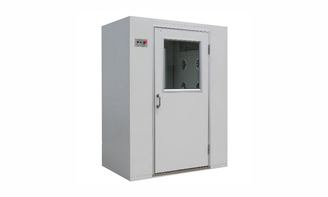 風淋室是人員進出潔凈室所必需的通道,并同時起到氣閘室密閉潔凈室的作用。為了減少由于人員進出所帶來的大量塵埃粒子,經高效過濾器過濾后的潔凈氣流由箱體兩側可旋轉噴嘴噴射至人/貨表面,有效而迅速清除塵埃粒子,清除后的塵埃粒子再由初、高效過濾器過濾后重新循環到風淋區域內。為了達到吹淋的最佳效果,風淋室設計的噴嘴出風口風速能達到18-22m/s以上,吹到人身上的風速最低18m/s,出廠的初始風淋時間設置為10秒。