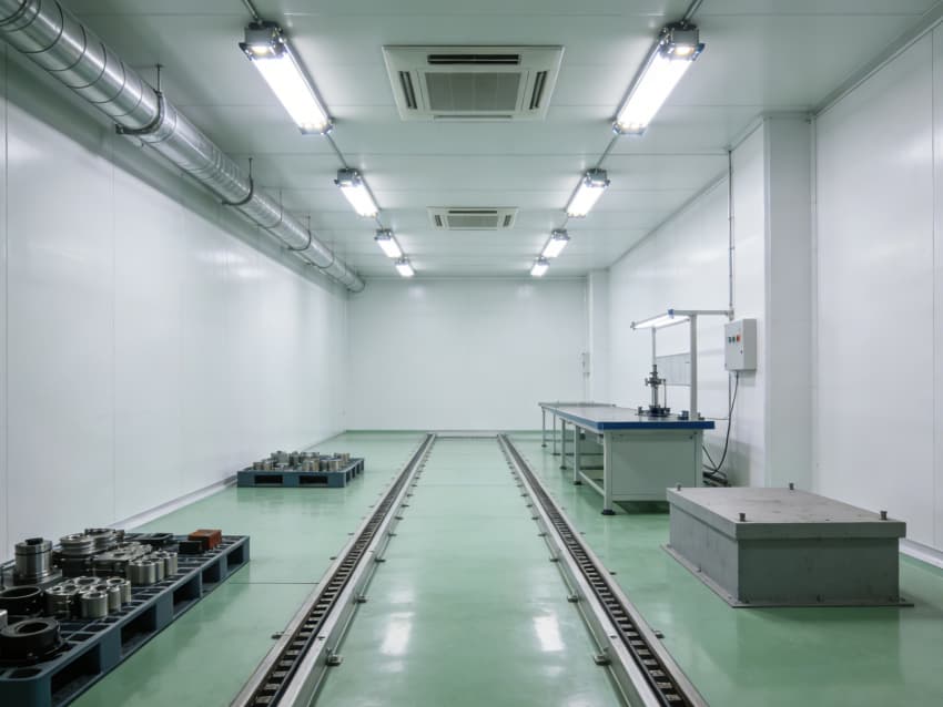 車間內(nèi)部施工工藝凸顯工業(yè)適配性:地面采用淺綠色防油耐磨環(huán)氧地坪工藝,經(jīng)基層固化處理、環(huán)氧砂漿找平、耐磨骨料撒布、罩面封閉四道核心工序,表面平整度誤差≤0.8mm/m,抗壓強度達(dá)C30以上,可耐受設(shè)備碾壓與油污侵蝕;墻面采用白色工業(yè)級潔凈涂層施工,推行無縫拼接技術(shù),陰陽角采用R40圓弧倒角工藝,杜絕積塵死角,涂層附著力強,可耐受高頻次清潔與工業(yè)粉塵侵蝕。