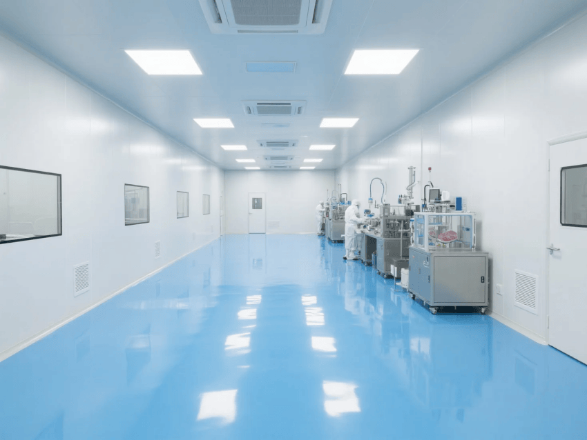 淺灰導靜電環氧地坪系統通過ISO13485認證,添加特殊導電填料,靜電消散時間<1秒;
